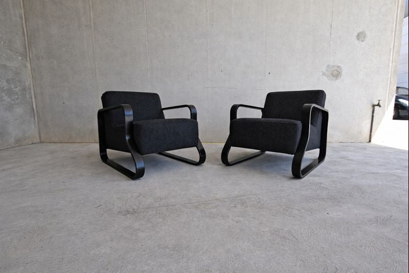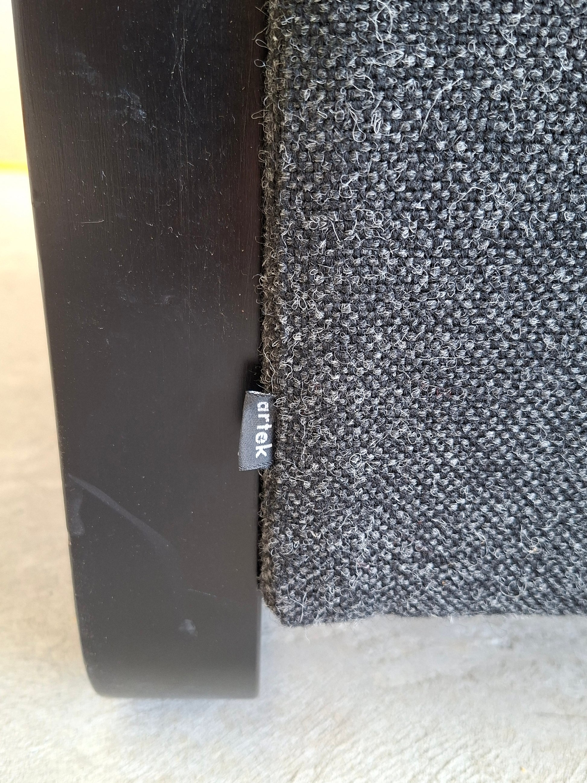 Description – A pair of Armchair 44 lounge chairs designed by Alvar Aalto for Artek. Featuring broad, flat bent birch plywood side frames finished in semi gloss black lacquer, with generously upholstered seat and back cushions. The chairs are upholstered in Kvadrat Hallingdal wool. A refined example of Aalto’s human-centred modernism, combining sculptural form with relaxed comfort.