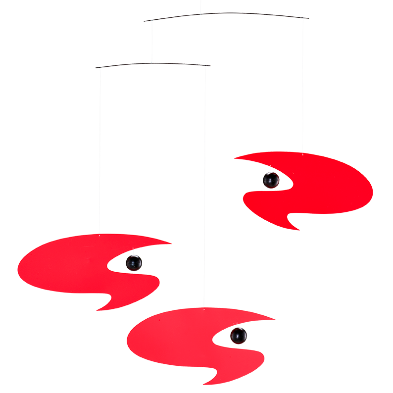 The Tango Mobile-Red. Inspired by a pair of dancers- a pair move across a dance floor in a dashing tango. The mobile as an aesthetic design in which simplicity, grace and elegance emphasise this feature.This makes it easy for you to fit Tango into any room of a certain size. Hangs 80cm High x 105cm Wide.