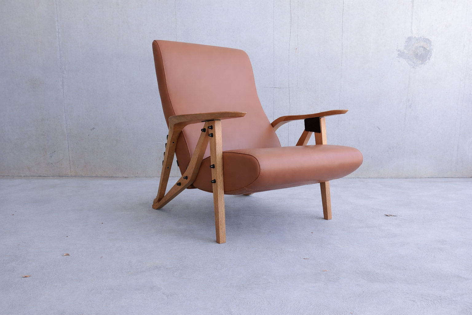 Description – Designed by Carlo Mollino in 1954 and produced by Zanotta in the 1990s, the Gilda reclining armchair is a masterclass in sculptural form and ergonomic design.Crafted from solid natural oak with a waxed finish, the frame showcases Mollino’s distinctive approach to structure, with a single, flowing element connecting the legs and leaf-shaped armrest. Satin black-nickel brass components add contrast and refinement, while the adjustable backrest provides four reclining positions for personalised comfort.
