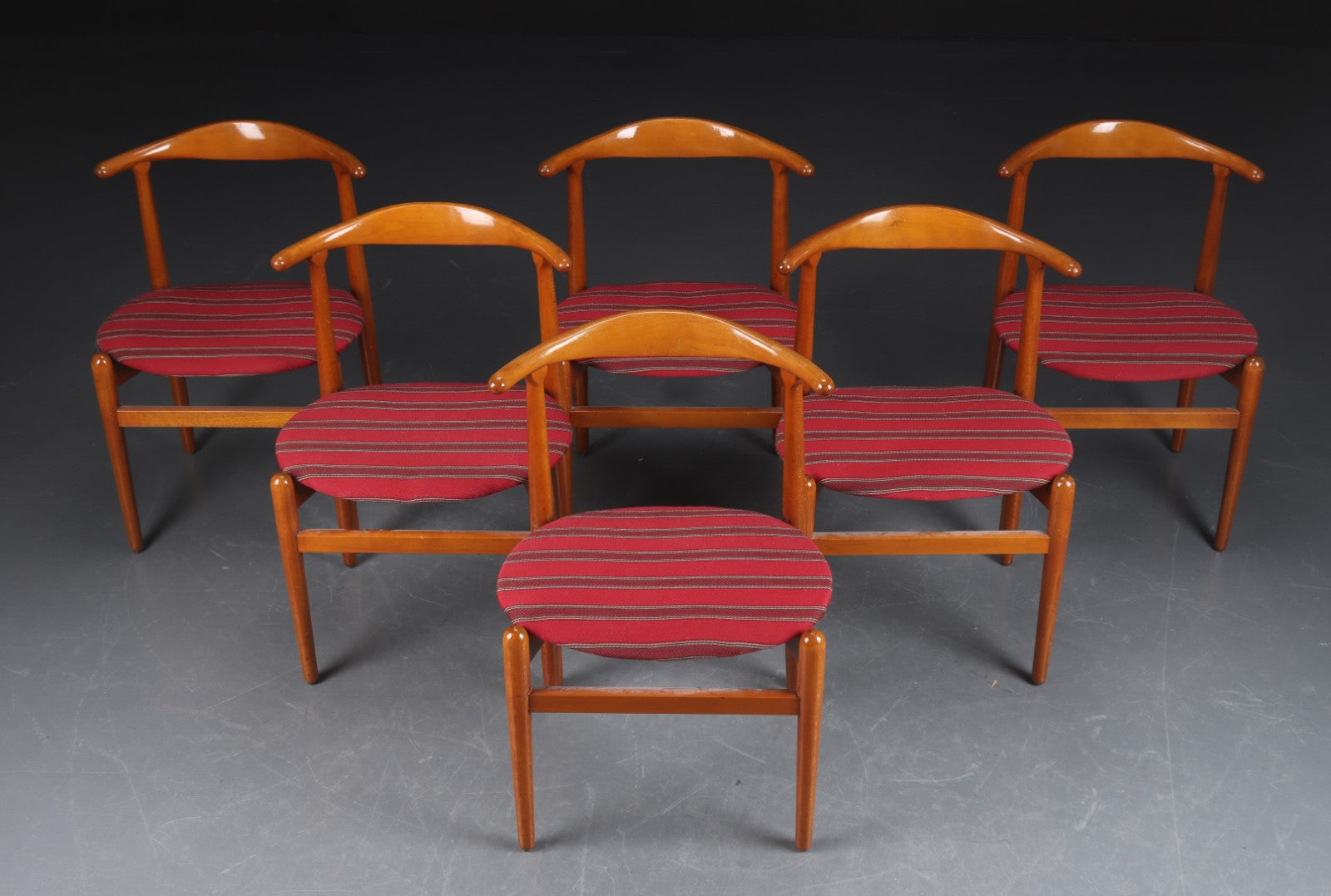 Set of six dining chairs, model 708. Made of stained and lacquered beech wood, seats upholstered with striped upholstery fabric, H. 72 cm. Sh. 43 cm. Manufactured by Fritz Hansen.