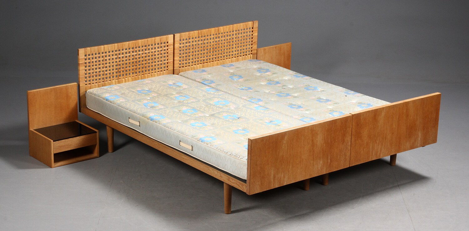 Description: Pair of Wegner-designed beds from the GE/34–36 bedroom series, manufactured by Getama in the 1960s. The design features a woven oak headboard panel, integrated bedside tables with drawer and open storage, and original black glass tops. The beds may be used side-by-side as a set or separated as individual singles.